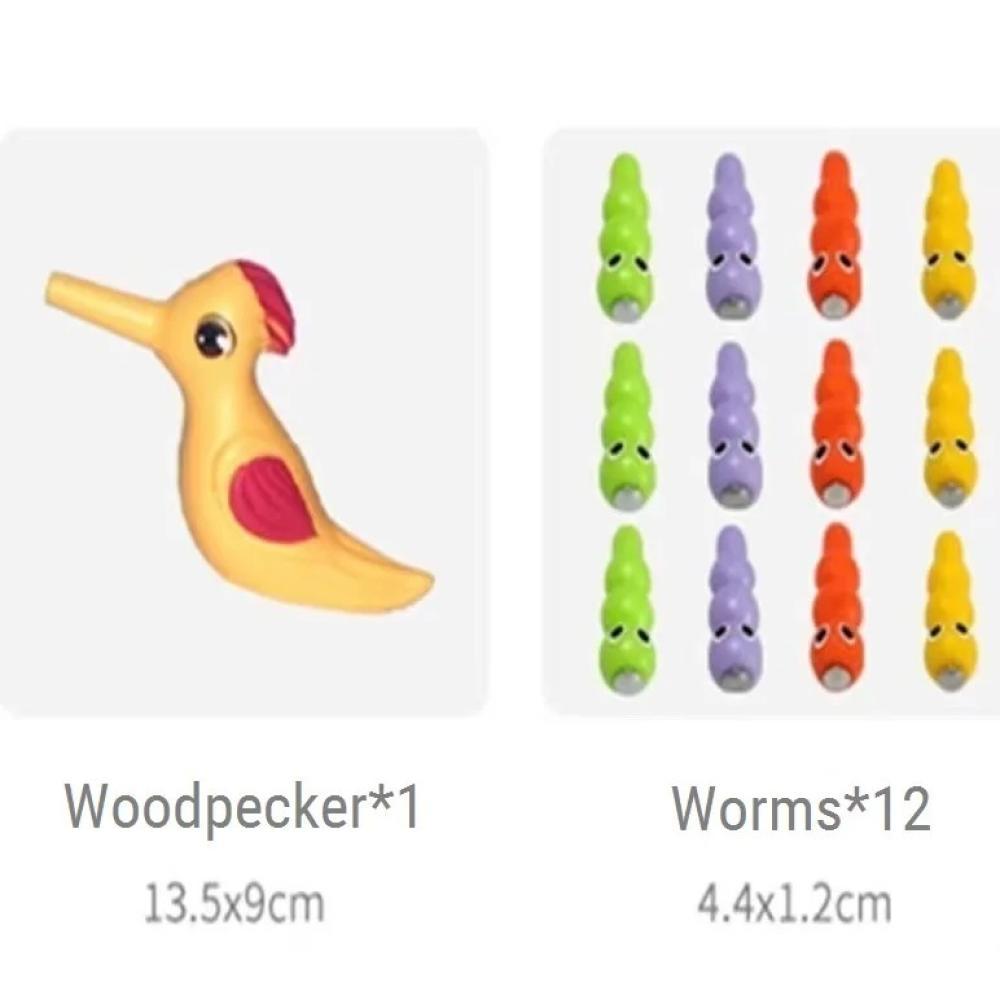 - نقار الخشب المغناطيسي: يتضمن اللعبة نقار خشب صغير مزود بنهاية مغناطيسية، وهو يتفاعل مع قطع خشبية صغيرة مغناطيسية على شكل ديدان أو كائنات أخرى. يحتاج الطفل إلى استخدام النقار الخشبي المغناطيسي لاصطياد الديدان أو الأشكال المغناطيسية الأخرى، مما يساعد على تطوير مهاراته الحركية الدقيقة.